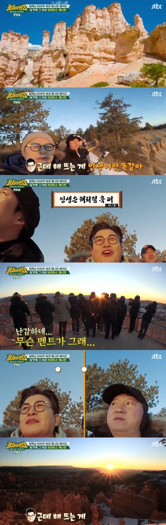 그러다 김용만은 "해가 뜨는 것이 인생이랑 똑같다. 뜰 때 저렇게 훅 뜬다"라고 의미심장하게 말했다. 장혁은 브라이스 캐니언의 33500여개의 돌기둥을 보고 "CG같다"고 감탄했다.