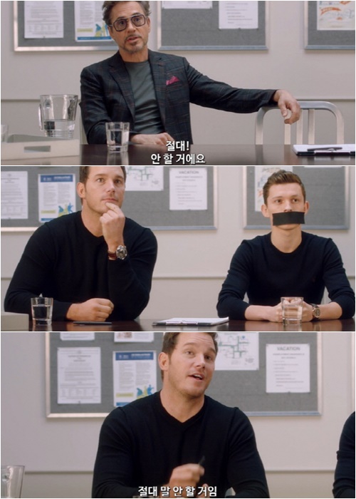 '어벤져스:인피니티 워'는 어느 때보다도 스포일러에 민감한 분위기다. 월트 디즈니 컴퍼니 코리아는 다우니 주니어, 톰 홀랜드, 크리스 프랫 등이 등 ‘어벤져스’ 멤버들이 펼치고 있는 ‘노 스포일러’ 캠페인 동참 메시지를 공개했다.