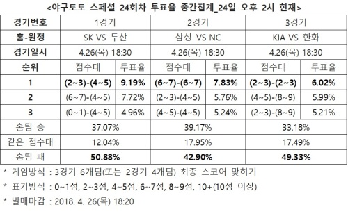 KBO 3경기 대상 야구토토 스페셜 24회차 투표율 중간집계
