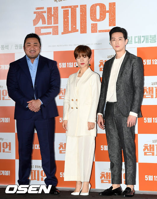 26일 오후 서울 자양동 롯데시네마 건대입구에서 ‘챔피언’의 언론배급시사회가 진행돼 마동석, 권율, 한예리 등 주연 배우들과 각본 연출을 맡은 김용완 감독이 참석해 영화의 연출 방향과 촬영기 등을 전했다.