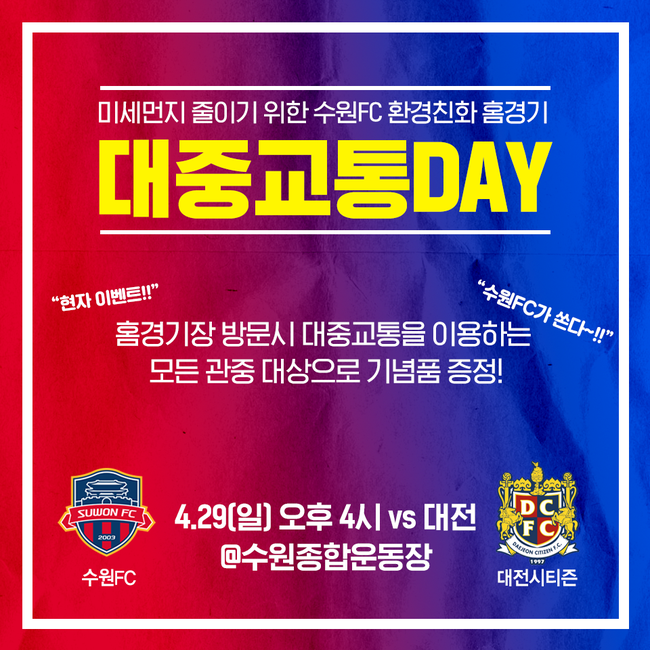 수원FC는 29일 오후 4시 수원종합운동장에서 펼쳐질 대전시티즌과의 홈경기를 ‘대중교통 이용의 날’로 지정, 대중교통을 이용해 홈경기를 방문하는 관람객을 대상으로 선물을 증정한다.