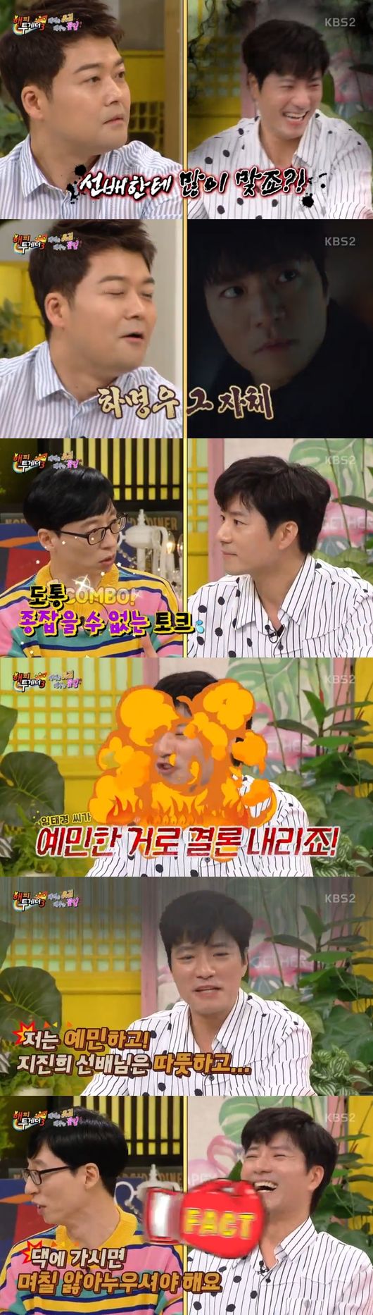 임태경은 본격 토크에 앞서 전현무에게 사과했다. 임태경은 "과거 노래방에서 전현무를 만났는데, 선배들에게 너무 깐죽대더라. 하극상처럼 보였다. 그래서 전현무에게 '선배에게 많이 맞죠?'라고 말했다. 그때 전현무씨를 잘 모르고 했던 말이다. 죄송하다"고 말했다.