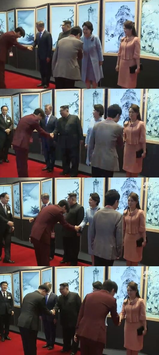 문재인 대통령과 김정숙 여사, 김정은 위원장과 리설주 여사가 일렬로 서 있는 가운데, 만찬 참석자들이 네 사람과 악수를 한 뒤 만찬장으로 들어가는 형식을 취했다.