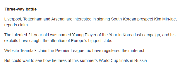 토크스포츠는 "리버풀, 토트넘, 아스날은 김민재에 대한 관심을 멈추지 않고 있다. 그들은 러시아 월드컵에서 김민재를 더욱 자세히 관찰할 기회를 가지기를 원하고 있다"고 주장했다.