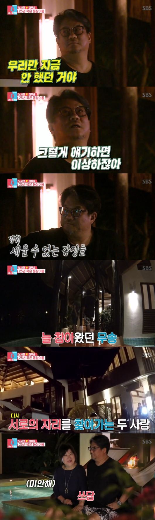 두 사람은 저녁 식사 후 와인을 마시며 분위기를 잡았다. 노사연은 "우리 앞으로 정직하자. 난 이제 내 감정 솔직하게 이야기 할거다. 당신이 이제 받아줘야한다"고 말햇다. 이에 욱한 이무송은 "너무 이기적이다. 정직했기 때문에 그 동안 싸운 거 아니냐"고 말했다.