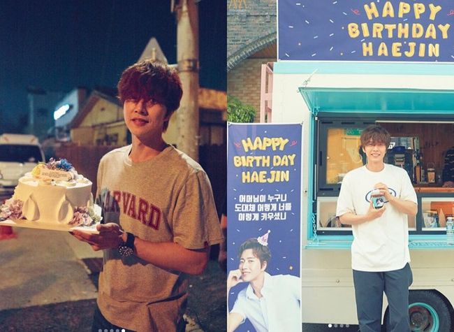 팬들은 이날 박해진의 생일을 기념해 커피차를 '사자' 촬영장에 보낸 걸로 알려졌다. 박해진은 자신의 얼굴이 그려진 떡 상자와 식혜병을 들고 포즈를 취하며 팬들의 사랑에 고마움을 전했다.