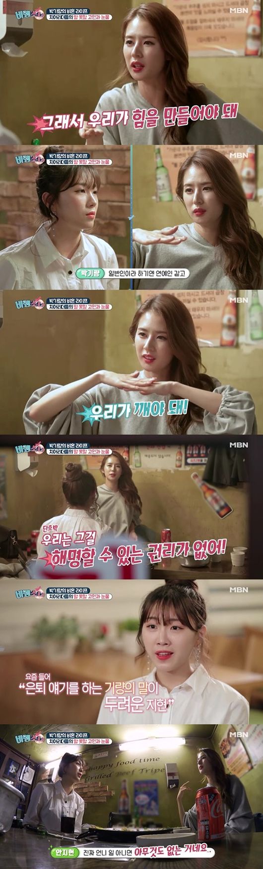 박기량은 학생 때부터 일에 올인하고, 다른 사람들이 쉴 때 일하는 치어리더의 특성 때문에 친구들을 거의 만나지 못해 지금은 인연이 다 끊어졌다고 고백했다. 안지현도 이에 매우 공감했다. 박기량은 최근 안지현의 인터넷방송 논란을 언급하며 “너가 많이 힘들었다는 걸 안다”고 위로했다.