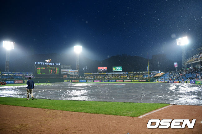 3회초 LG가 양석환의 솔로 홈런으로 1-0 리드를 잡은 뒤 빗줄기가 굵어졌다. 결국 3회초 1사 1루 상황에서 심판진이 우천 중단을 선언했다. 오후 7시18분. 곧바로 한화 구장관리팀에서 대형 방수포로 내야 전체를 덮었다.