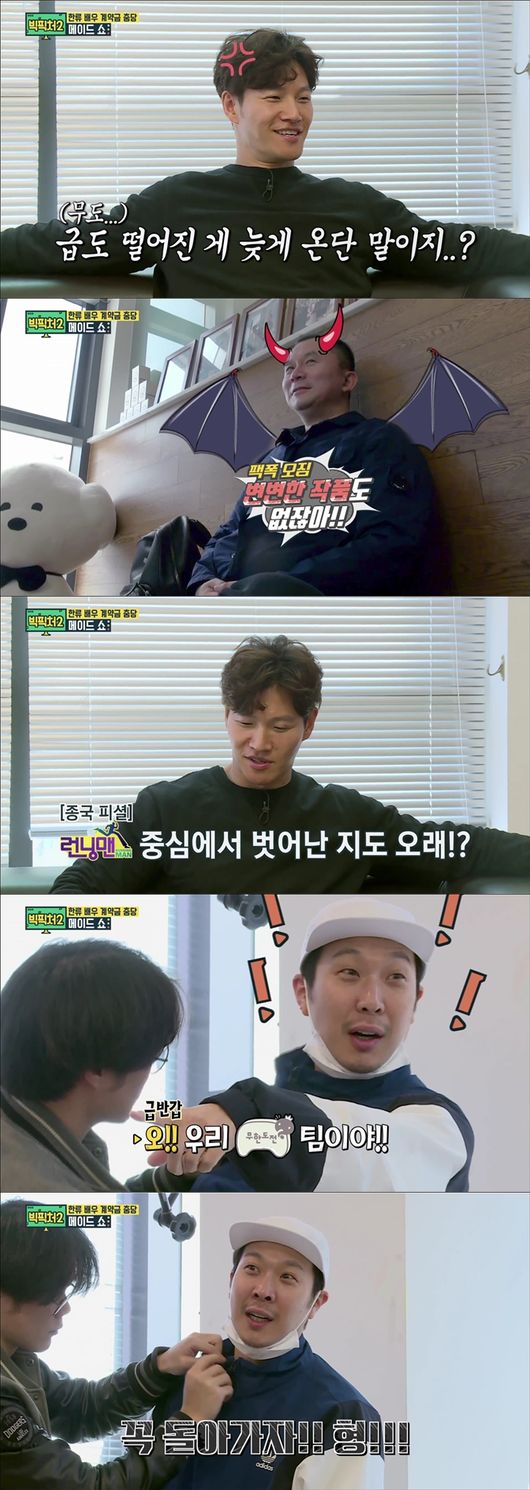 그러자 김종국은 "무한도전도 안 해서 급 떨어진 게 진짜"라며 하하의 '급' 하락 논란에 불씨를 붙였다. 여기에 여운혁PD는 "(하하는) 변변한 작품도 없잖아"라며 덧붙였고 김종국은 "런닝맨에서도 이미 중심에서 벗어났다"며 '하하몰이'에 환상적인 궁합을 자랑해 웃음을 자아냈다.