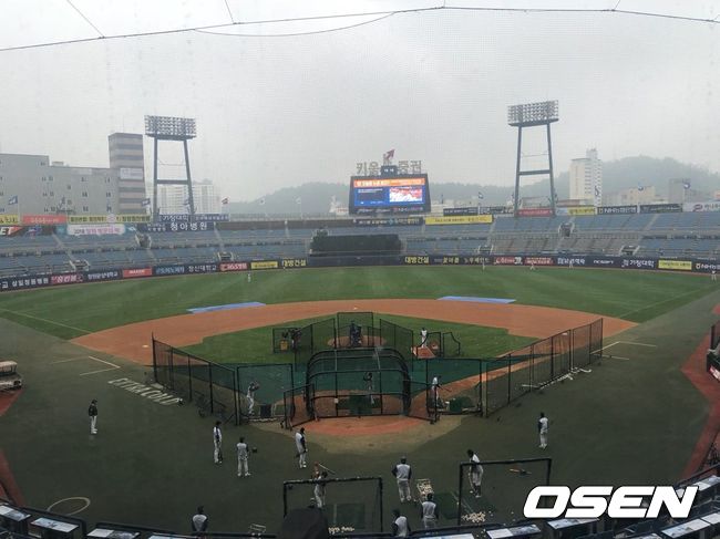 오후 4시 30분 현재 마산구장에는 안개비가 내리고 있다. 빗방울이 보이지는 않지만 마치 대기 중에 스프레이를 뿌린 것처럼 운동장을 촉촉하게 적시고 있다. 일기예보에 따르면 당초 빗줄기는 오후 12시경부터 그칠 전망이었으나 오후까지 이어 내리고 있다. 그렇다고 우천취소를 우려할 정도의 심각한 상황은 아니다.