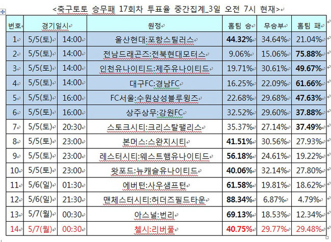국내,외 프로축구 14경기 대상 축구토토 승무패 17회차 투표율 중간집계 결과