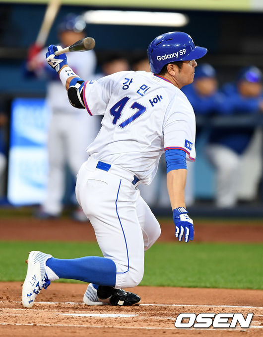 6번 포수로 선발 출장한 강민호는 0-0으로 맞선 2회 김헌곤의 중전 안타로 만든 무사 1루서 첫 타석에 들어섰다. 강민호는 SK 선발 김태훈과 3B1S에서 5구째를 잡아 당겼고 좌측 외야 스탠드에 꽂았다. 비거리는 115m. /what@osen.co.kr