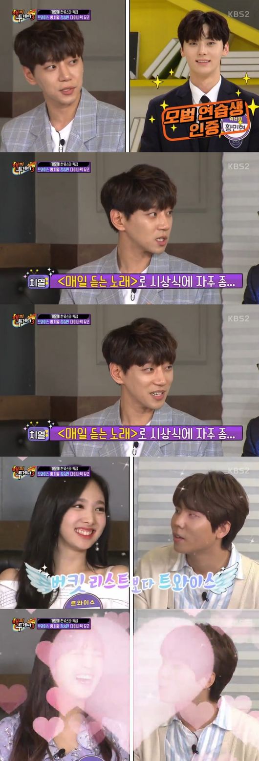 3일 방송된 KBS '해피투게더2'에는 트와이스, 황치열, 정승환, 다듀가 출연해 노래방 대결을 펼쳤다. 정승환은 "노르웨이 여행 중에 섭외 요청을 받았다"고 말했다.