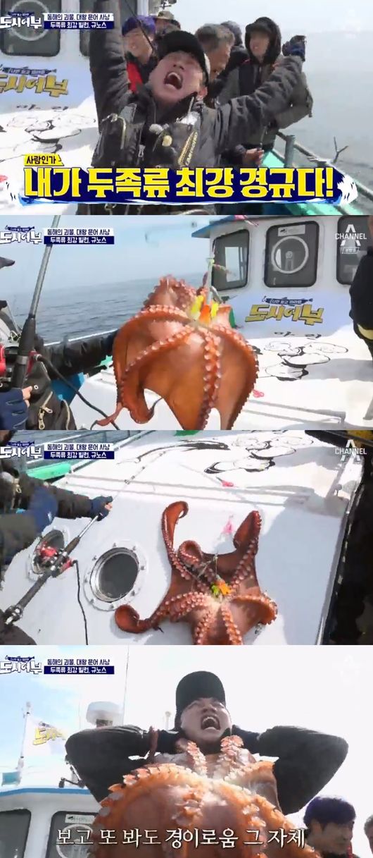 드디어 330분만에 첫 입질이 왔다. 이경규가 대왕 문어를 낚아 올렸다. 엄청난 크기에 다른 멤버들도 놀라워했다. 이경규는 "드론~해냈어"라며 기뻐했다. 에릭과 다른 멤버들 역시 이경규가 잡은 대왕문어와 인증사진을 찍었다.