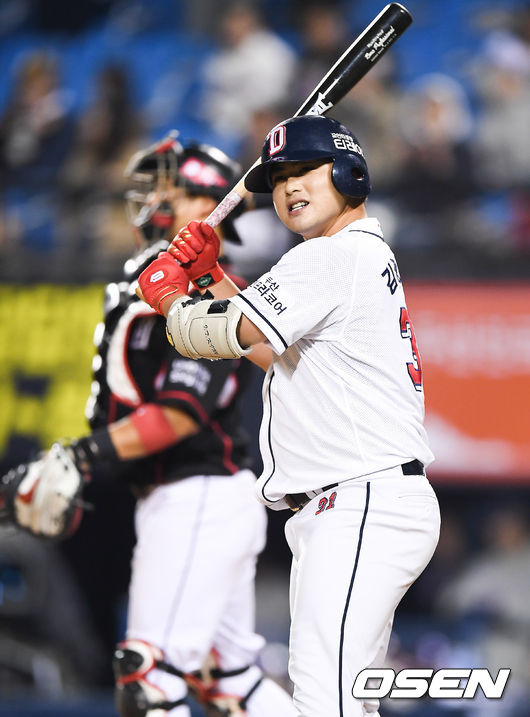 타석에 들어선 선수는 김정후. 두산은 연장전 돌입과 동시에 지명타자로 나섰던 김민혁을 3루수로 바꾸고, 2번타자 허경민 타석에서 대타로 나온 박세혁 자리에 투수 함덕주가 이름을 올리면서 두산은 지명타자가 소멸됐다. 자연스럽게 투수로 나선 김정후가 타석에 나서게 됐다.