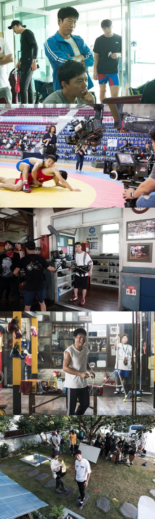 먼저 김대웅 감독과 함께 진지한 표정으로 촬영 장면을 모니터링하는 살림 9단 아들 바보 ‘귀보씨’ 역 유해진과 직접 레슬링 경기 장면을 소화하고 몸에 촬영장비를 착용한 채 열연을 펼치는 레슬링 유망주 아들 ‘성웅’ 역 김민재의 모습은 한여름을 뜨겁게 보냈던 배우들의 노력으로 눈길을 끈다.
