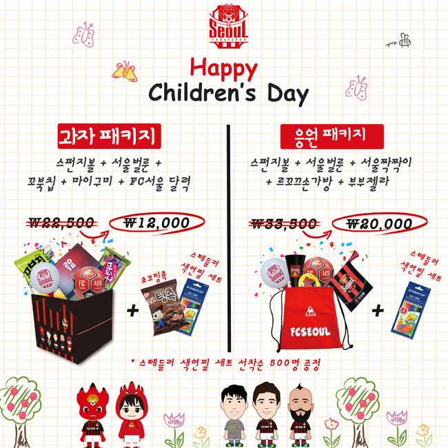 FC서울이 어린이날을 맞이하여 과자와 응원도구로 구성된 특별 선물 패키지 2종 및 장난감 신상품을 출시한다. 특히, 이번에 제작되는 어린이날 특별 선물 패키지는 최대 약 40%까지 할인된 금액으로 어린이들이 좋아하는 과자 및 FC서울 상품을 한번에 구매할 수 있어서 어린이날 최고의 선물이 될 전망이다.