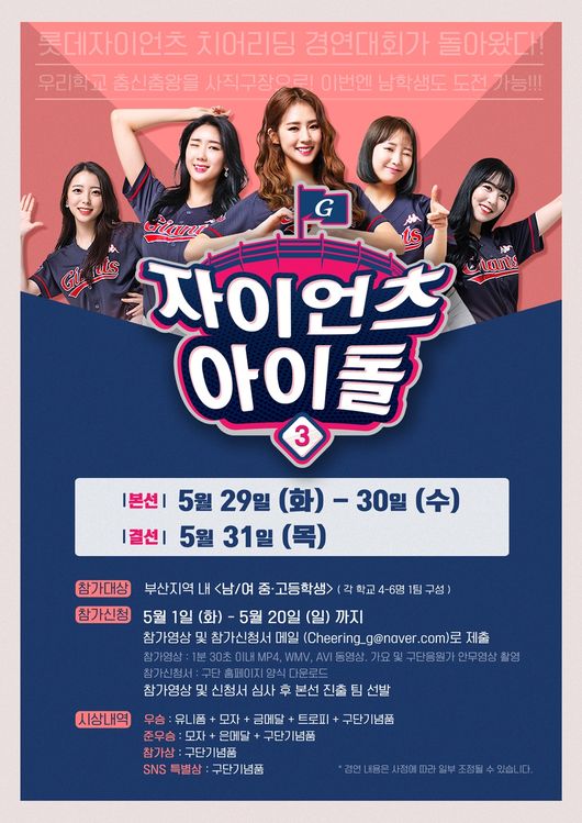 올해로 3회째를 맞이한 자이언츠 아이돌은 부산지역 중,고등학생 대상 치어리딩 경연대회로 학생들이 직접 치어리딩을 기획해 마음껏 끼를 발산하는 이벤트다. 특히 올해부터 남학생들도 참가 가능해 더욱 다양하고 기발한 퍼포먼스가 펼쳐질 것으로 보인다.