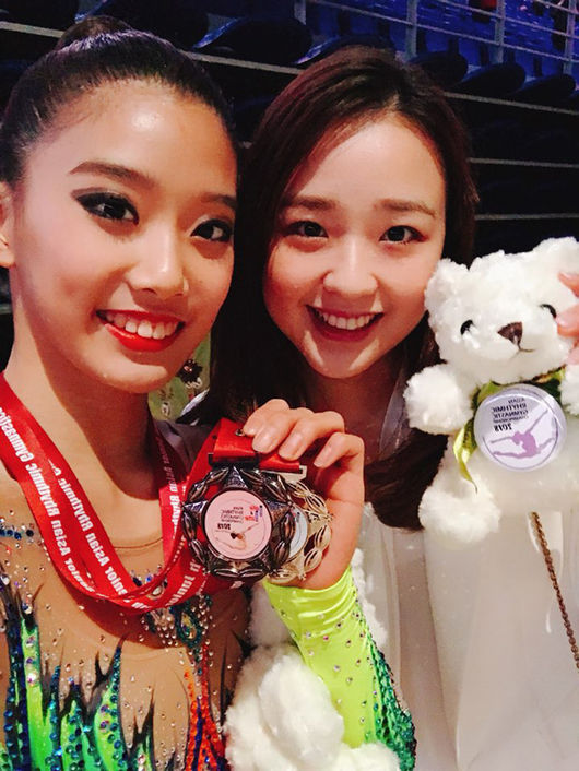 [사진2]대회 참관차 방문한 손연재(오른쪽)과 기념촬영한 김채운=사진제공/김채운 에이전트