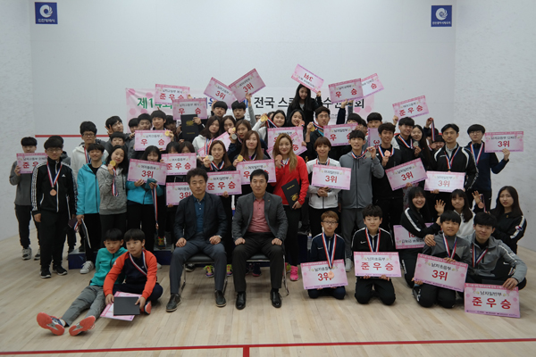 [사진]대회를 마친 후 입상자들과 대회 관계자들이 기념촬영을 하고 있다. /대한스쿼시연맹 제공