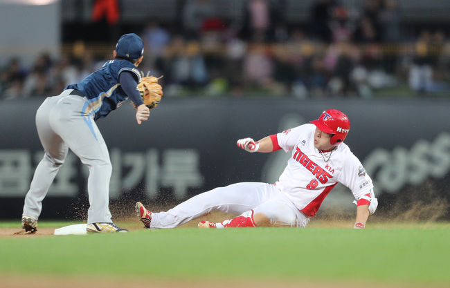 KIA의 쉼없이 발을 놀렸다. 6회말 나지완의 솔로포로 4-3으로 역전에 성공했고 이후 김민식이 볼넷으로 걸어나갔다. 그리고 김민식은 이명기의 타석 때 기습적인 2루 도루를 시도해 성공시켰다. NC의 비디오 판독이 진행됐지만 결과는 달라지지 않았다. 그리고 이명기의 좌익선상 2루타가 터지면서 김민식은 여유있게 홈을 밟아 5-3으로 달아났다.