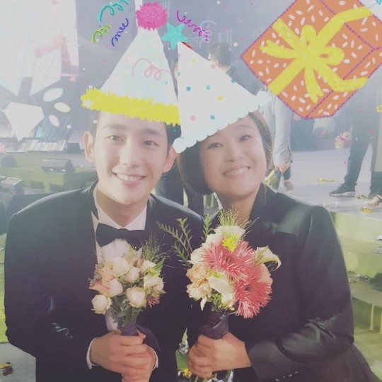 방송인 송은이는 5일 자신의 SNS에 "대기실에서 메이크업하다가 달려와 인사하는 녀석은 니가 처음이야. 절반만 완성된 메이크업도 너무 멋있더라. 처음 만났던 6년 전과 너무나 똑같이 한결같은 사람. 더 잘 되어도 너무 좋을 사람. #축하해 #백상예술대상"이라는 글과 함께 한 장의 사진을 게재했다.