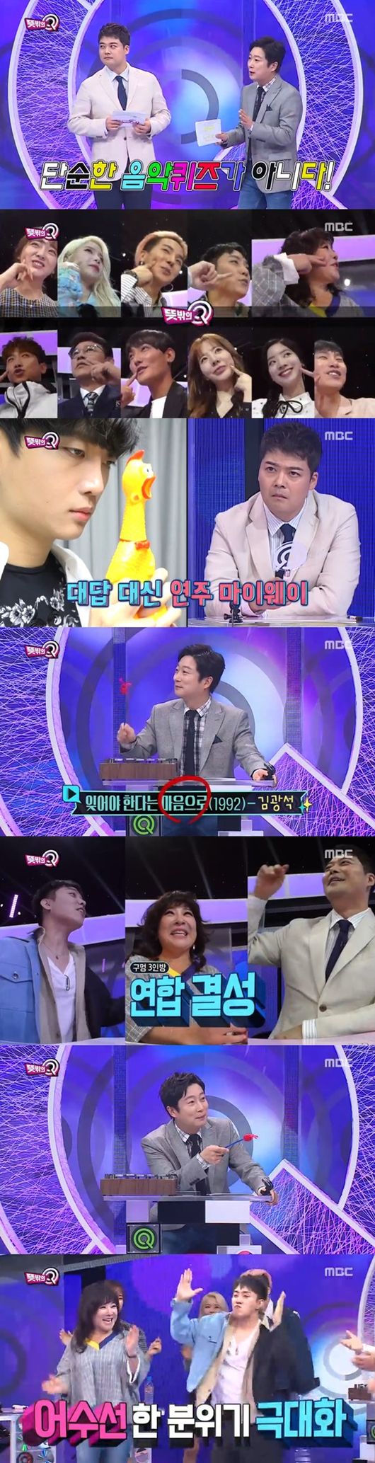 지난 5일 오후 첫 방송된 MBC 예능 프로그램 '뜻밖의 Q'에서는 12명의 뮤지션이 시청자들이 출제한 음악 문제를 푸는 모습이 그려졌다.
