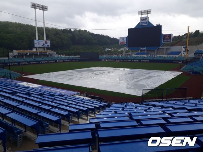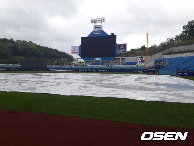 새벽부터 내린 비가 오후에도 계속 예보가 돼 있다. 정오 현재까지 꽤 많은 양의 비가 내리는 중이다. 삼성 구단에서 대형 방수포로 내야 전체를 덮었지만 외야는 젖어있다.