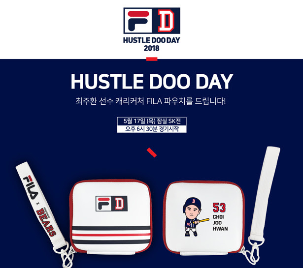 이번 '휠라 허슬두데이' 주인공은 최주환이다. 두산은 이날 레드석 102, 202 블럭을 ‘허슬두데이A존’, 레드석 101, 201 블럭을 '허슬두데이 B존'으로 편성해 이 좌석을 예매한 팬들에게 최주환 캐리커처 FILA 파우치를 선물한다.