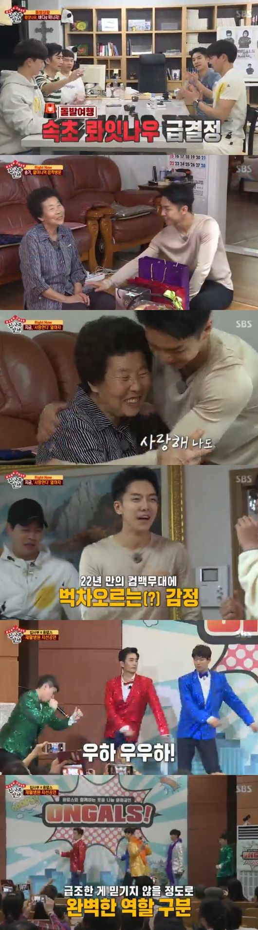 이어 이승기 할머니댁을 찾았고, 할머니는 모두를 손자처럼 맞아주셨다. 이승기는 "방송에서 할머니를 보니 또다른 감동이 느껴진다"며 할머니를 안아드렸다. 이어 그는 처음으로 "사랑한다"는 말을 해 할머니를 기쁘게 했다.