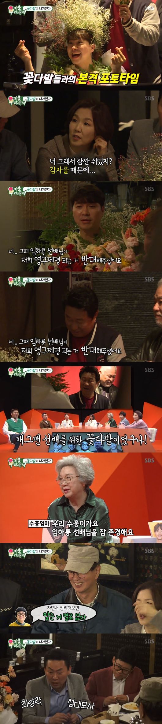 꽃다발이 되어 나타난 자리에는 임하룡을 비롯해 엄용수, 이성미, 전유성, 이경래 등 내로라하는 개그맨 선배들이 자리해 있었다. 데뷔 27년 된 박수홍도 까마득하게 어린 후배가 됐다.