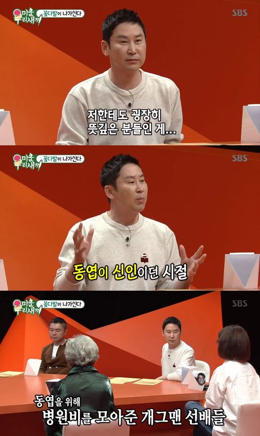 신동엽 역시 개그맨 선배들의 의리와 정에 대해 말을 더했다. 그는 어머니가 돌아가셨을 당시를 떠올리며 "바로 앞에서 문상객을 맞이하는데 최병서 형님이 앞에 있으면서 오는 개그맨 누구든 흉내를 너무 똑같이 계속 내는 거다. 사실 웃으면 안 되는데 들리는데 너무 똑같은 거다. 우리 가족들도 안 웃어야 하는데 안 웃을 수가 없었다. 그때 정말 고역이었다. 그런데 원래 재밌게 하는 게 줄초상 당하지 말라고 하는 거라고 하더라. 개그맨 선배들이랑 있으면 진짜 좋다"고 말했다.