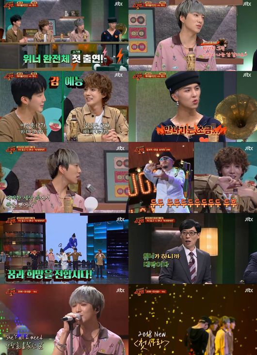 이날 MC 유재석과 유희열은 위너를 보며 "완전체 처음이다"며 반가워했다. 위너 승윤은 "이렇게 다같이 나올 수 있어서 뭔가 안정감도 든다, 완성된 느낌"이라며 역시 기뻐했다. 그러자 위너 승훈은 민호와 승윤을 보며 "실력파"라면서 자신과 진우를 향해 "예능감"이라 칭했고, 이어 "실력파와 예능감이 만났다"고 셀프 칭찬해 웃음을 안겼다.