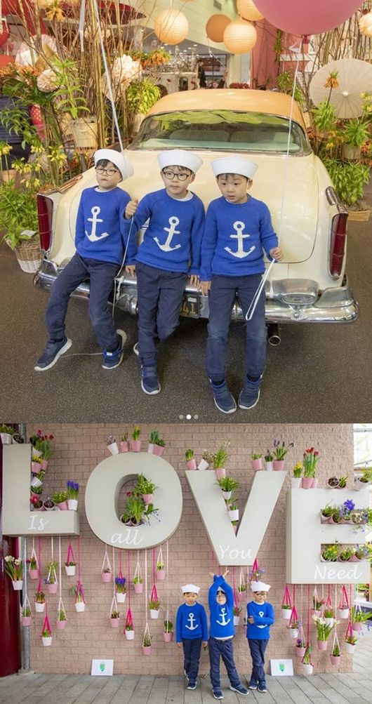 공개된 사진은 송일국의 아들인 세 쌍둥이, 삼둥이가 똑같은 옷을 갖춰입고 각자 다른 포즈를 취하고 있으며, 무엇보다 아버지를 닮아 벌써부터 눈에띄는 삼둥이의 기럭지 비율이 눈길을 끈다.