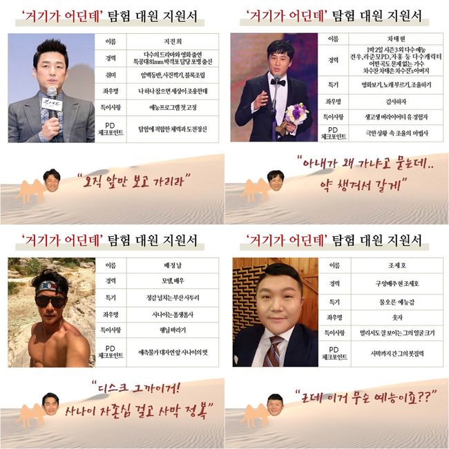 이 가운데 지진희-차태현-배정남-조세호의 ‘탐험 대원 지원서’가 깜짝 공개됐다. ‘경력사항’부터 ‘PD 체크포인트’까지 깨알같이 담겨있는 탐험 대원 지원서를 통해 사막 탐험이라는 ‘극한 상황’에서 탐험대원 각각이 어떤 면모를 드러냈을지, 또한 달라도 너무 다른 4인방이 어떤 케미스트리를 만들어냈을지 궁금증을 자극한다.