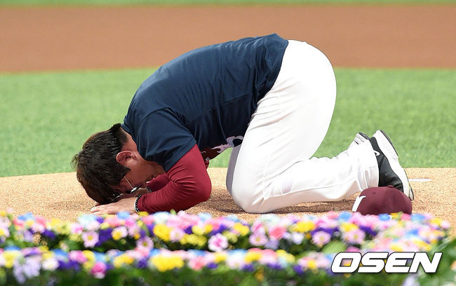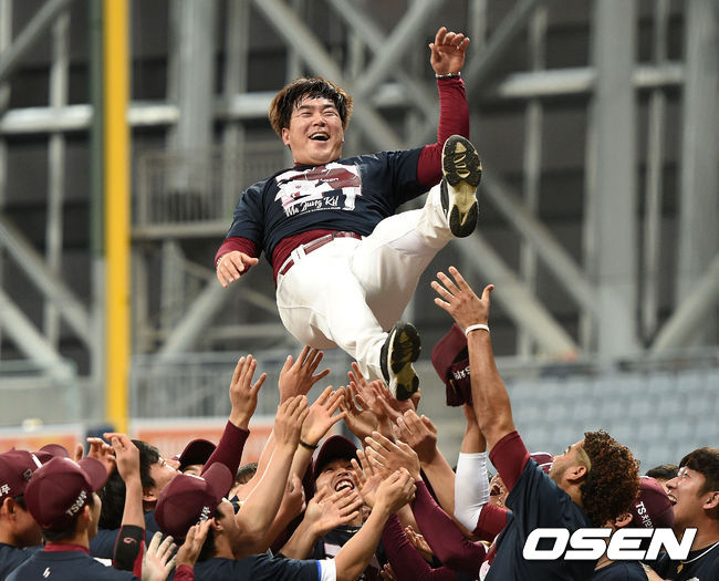 마운드 위에 마련된 꽃단상에 선 마정길은 “넥센과 한화에서 선수생활을 잘 보냈다. 은퇴식을 마련해준 구단에 감사드린다. 지도자로서 제2의 인생을 잘 살겠다”고 소감을 전하며 끝내 눈물을 보였다. 이후 마정길은 마운드에서 팬들에게 큰 절을 올렸다. 넥센 선수들이 그라운드로 올라와 마정길의 은퇴를 축복하는 헹가래를 쳤다. / jasonseo34@osen.co.kr