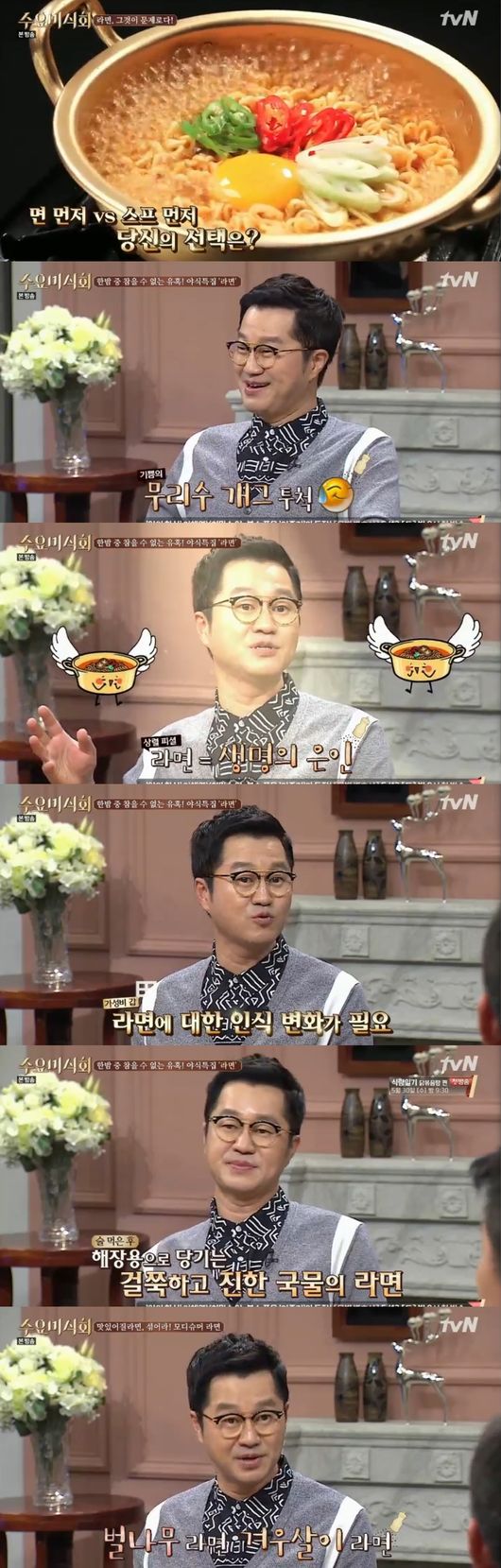 9일 tvN 예능 '수요미식회'에서 라면을 예찬한 지상렬이 출연했다. 이날 전현무는 한달간 '야식특집'을 진행할 것이라 소개, 한 밤 중 참을 수 없는 유혹을 주는 '라면'이 소개됐다.
