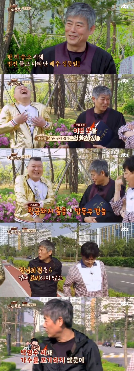 성동일은 등장부터 남달랐다. 서울동부지방법원 앞에서 오프닝을 시작했는데 성동일이 ‘한끼법전’을 들고 판사복을 입고 갔던 것.