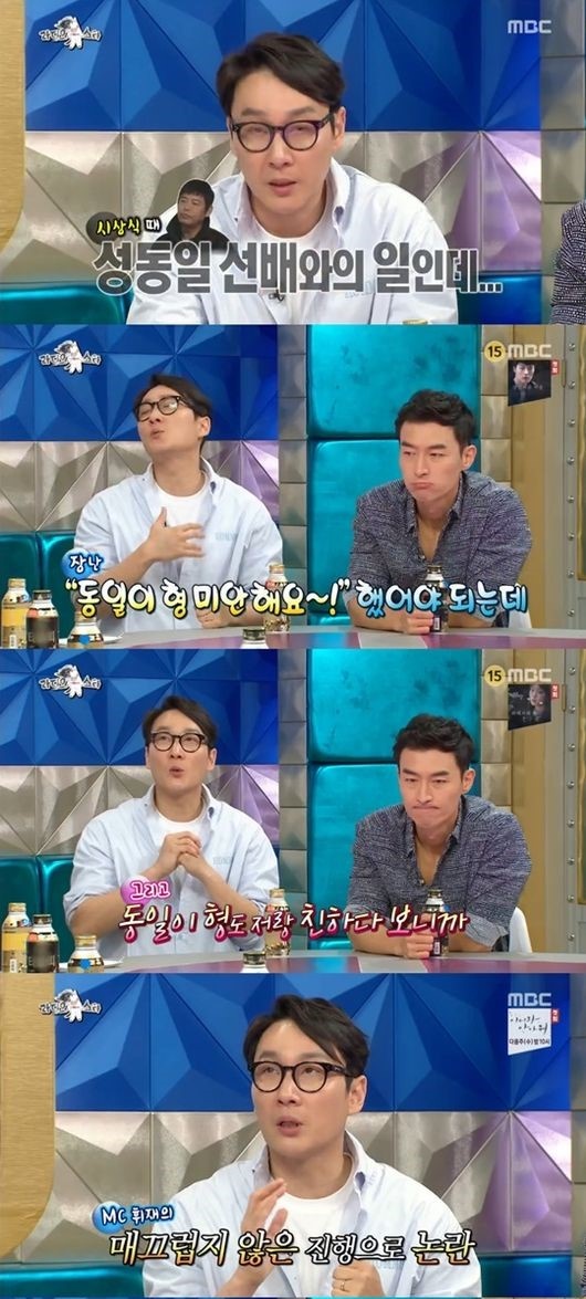 이휘재는 이에 대해 '라디오스타'에서 "내가 동일이 형과 친하다 보니 형도 나에게 상황극처럼 그런 표정을 보여줬는데, 그게 (정색처럼 보여서) 논란이 됐다. 동일이 형이랑 내 상황극을 다들 알겠지 싶었는데 그걸 완전 잘못 생각했다. 완전한 나의 착오였다"고 고백했다.