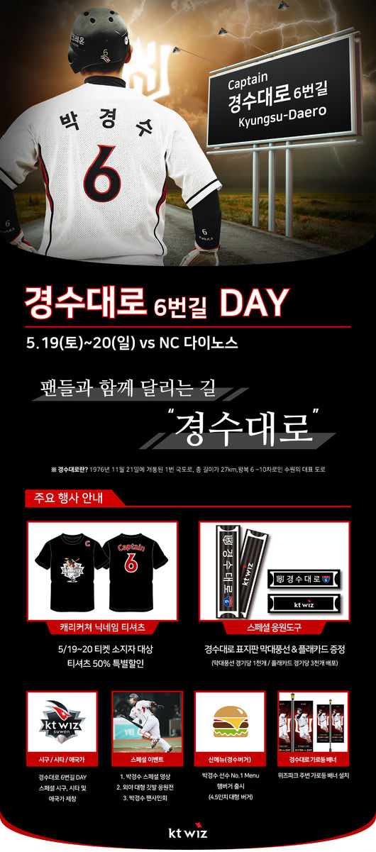 kt wiz 야구단은 오는 19~20일 수원 KT 위즈파크에서 열리는 NC와의 홈경기에 창단 후 처음으로 선수 Day를 마련한다. 영예의 1호 주인공으로는 '캡틴' 박경수를 선정하고 '경수대로 6번길 DAY!'로 진행한다. 선수 Day 행사는 팬들의 사랑에 보답하고 팬과 선수가 더욱 가까워지는 계기로서 기획됐다.