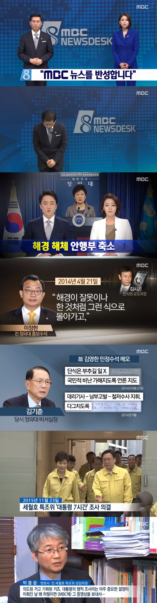 세월호 참사에 대해 MBC는 할 말이 없다. 최승호 사장이 임명된 후 재정비 된 '뉴스데스크'에서 앵커가 "세월호를 구하지 않고 정권을 구했고 정부의 입이 돼 권력에 충성했다"며 MBC가 스스로 가장 잘못한 보도로 세월호 사건을 언급했다.