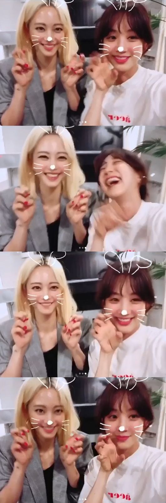 사진 뒤에 덧붙인 영상에서 두 사람은 더없이 환한 웃음을 짓고 있다. 스티커 어플이 신기하고 재밌는 듯 귀여운 포즈를 취하다가 호탕하게 웃어 눈길을 끈다.