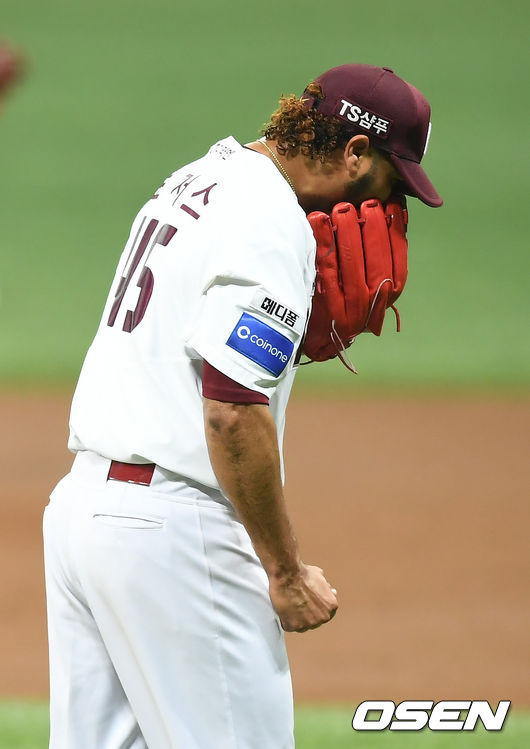 3회 임병욱의 솔로포로 1-1 동점이 됐다. 로저스는 5회 양성우에게 다시 1타점 적시타를 맞았다. 이어 6회 하주석의 1타점 적시타에 이성열이 홈인했다. 6회까지 115구를 던진 로저스는 1-3으로 뒤진 7회 마운드에서 내려와 패전위기다. / jasonseo34@osen.co.kr