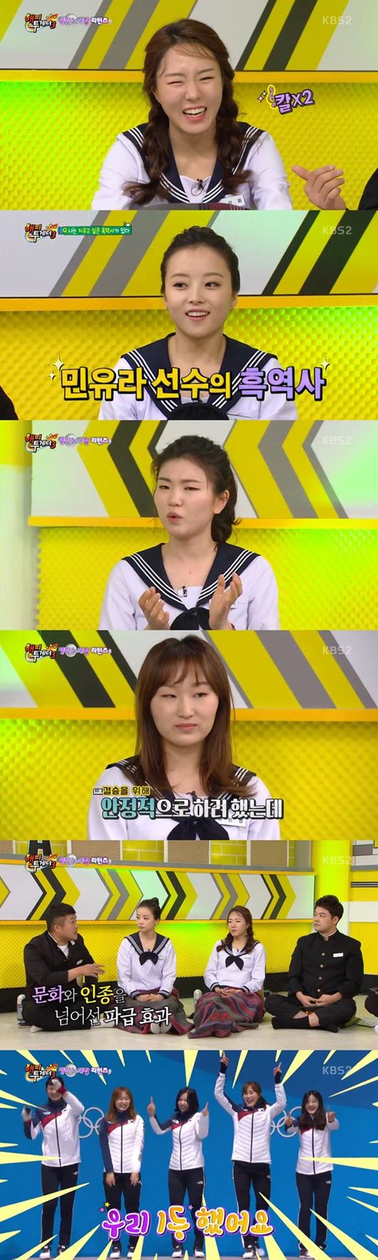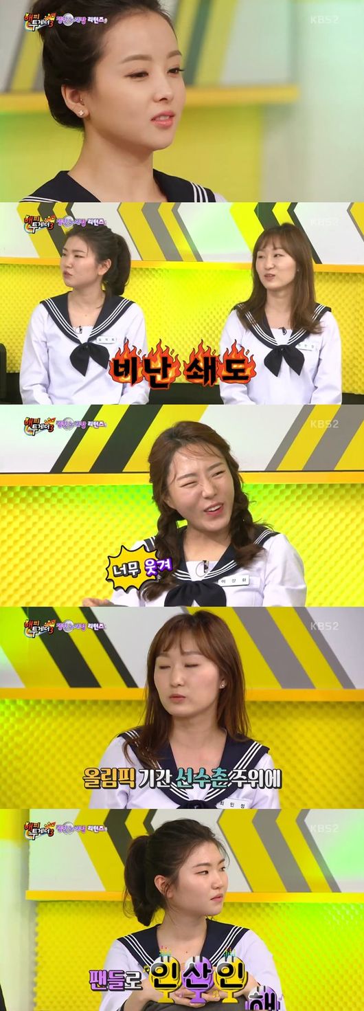 10일 오후 방송된 KBS 2TV 예능프로그램 '해피투게더3'에는 2018 평창동계올림픽에서 활약한 이상화와 심석희, 최민정, 민유라 선수가 출연해 재치 있는 입담을 뽐냈다. '쟁반노래방' 콘셉트로 진행된 이번 코너에서 솔직한 입담을 자랑하며 예능감을 뽐냈다.