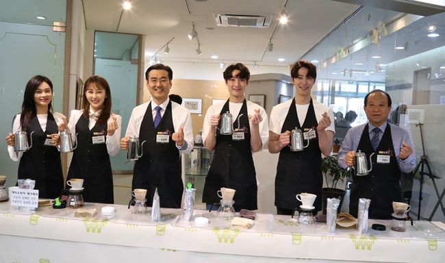 배우 정나온 유세례 이기백 박준호 등이 몽골 사막화 방지를 위해 일일바리스타로 나섰다.