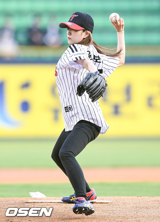 윤보미는 10일 잠실구장에서 열린 롯데-LG전에 시구자로 나섰다. ‘봄가너’라는 별명답게 윤보미는 투수판을 밟고 던졌다. 마운드보다 훨씬 가까운 곳에서도 던지지 못하는 다른 아이돌과는 투구의 클래스가 달랐다. 포심그립을 잡은 윤보미는 바운드 없이 포수 유강남의 미트에 정확하게 스트라이크를 꽂아 넣었다. 지켜보던 LG 주장 박용택이 깜짝 놀랄 정도로 정확한 투구였다.