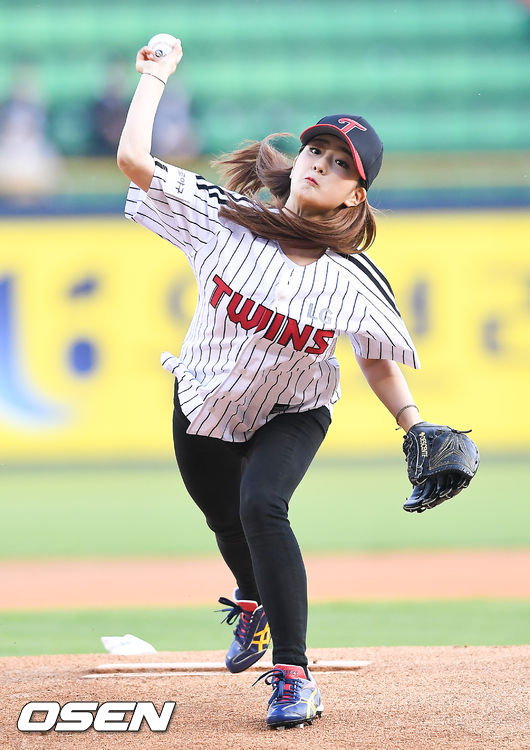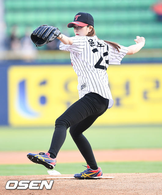 윤보미는 10일 잠실구장에서 열린 롯데-LG전에 시구자로 나섰다. 최근 '개념 시구'의 대표자로 꼽히는 윤보미는 일반적인 아이돌 시구자와는 달랐다. 스파이크를 신고 진지하게 시구를 준비했고, 18.44m 거리의 마운드 투구판을 밟고 힘차게 던졌다.