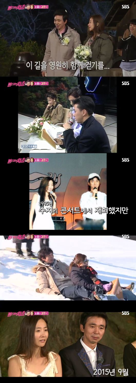 방송인 김국진, 가수 강수지 커플이 ‘불타는 청춘’에서 작은 결혼식을 올렸다. 두 사람은 당초 결혼식을 올리지 않겠다고 했었는데 양수경이 준비한 결혼식에서 부부로서 첫 발을 내딛었다.