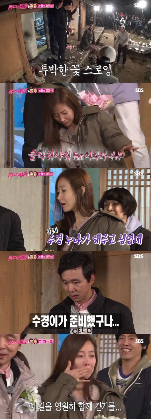 하지만 양수경이 두 사람을 위한 ‘잔치’를 조용히 준비했다. 준비를 모두 마친 후 김국진과 강수지가 나오자 멤버들은 두 사람을 향해 꽃을 던지는 플라워 샤워를 했고 부토니에를 달아주고 부케를 전달했다.