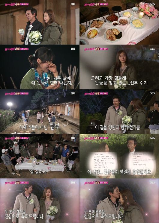 이날의 하이라이트는 청춘들이 정성껏 준비한 김국진, 강수지의 깜짝 결혼식이었다. 정선 첩첩 산중에서 예상치도 못했던 스몰 웨딩을 선물받은 두 사람은 처음에는 당황한 기색이 역력했으나 이내 강수지가 꾹꾹 참았던 눈물을 흘리자 주위를 한순간에 눈물 바다로 만들었다. 특히 친정 언니의 마음으로 이틀 동안 밤을 새며 이바지 음식을 준비한 양수경에게 수지는 “언니 고마워요”라며 감동했다. 이에 양수경은 “이제 내가 수지 친정이니까 속 썩이면 가만 안 두겠다”며 귀여운 엄포를 놓았다.